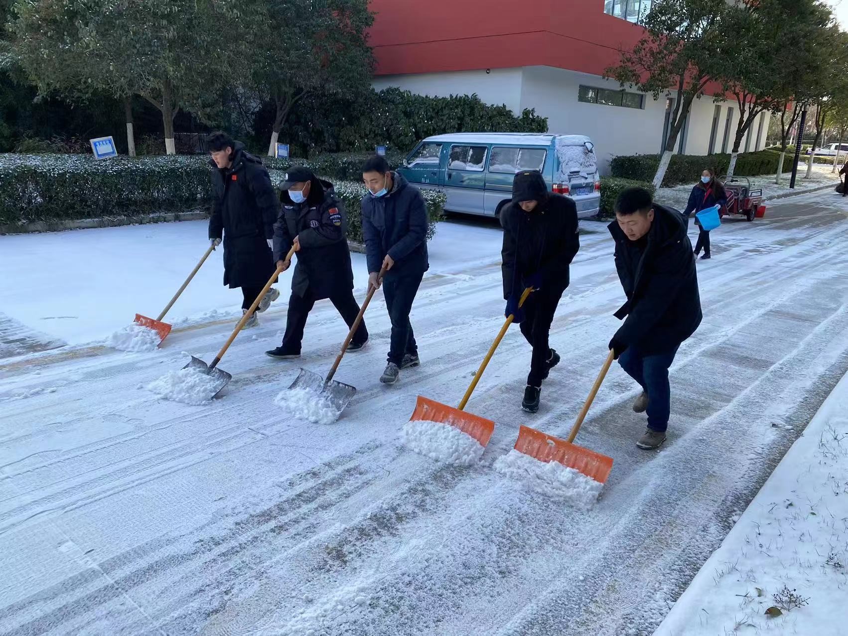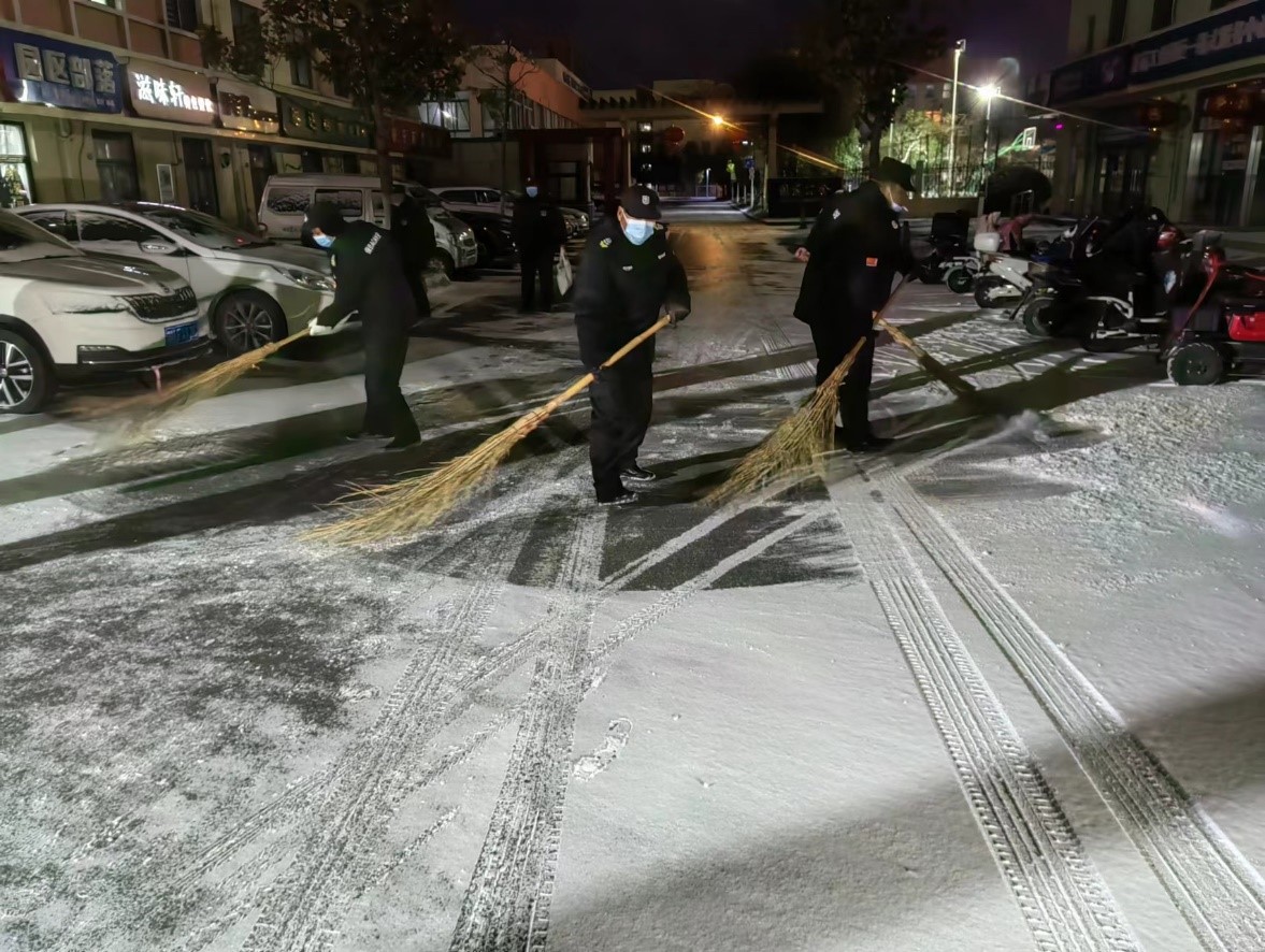 由于夜間雪情,道路積雪結冰,14日夜間,公司啟動應急預案,調集現(xiàn)場人員,利用掃把、鐵鍬針對各道口、坡道及主要行人路段開展作業(yè),確保各項目道路通行順暢。