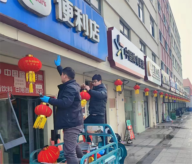 物業(yè)管理部工作人員扛上梯子,拿著燈籠,為沿街商鋪門前掛上了一個個大紅燈籠,將我們商業(yè)區(qū)裝點的漂漂亮亮。過年掛燈籠是中國傳統(tǒng)習俗,紅色代表喜慶,圓形燈籠則寓意團圓美滿,紅燈籠象征著平安祥和和紅紅火火。建發(fā)公司希望商鋪們日子過的紅紅火火,過一個平安祥和幸福年。