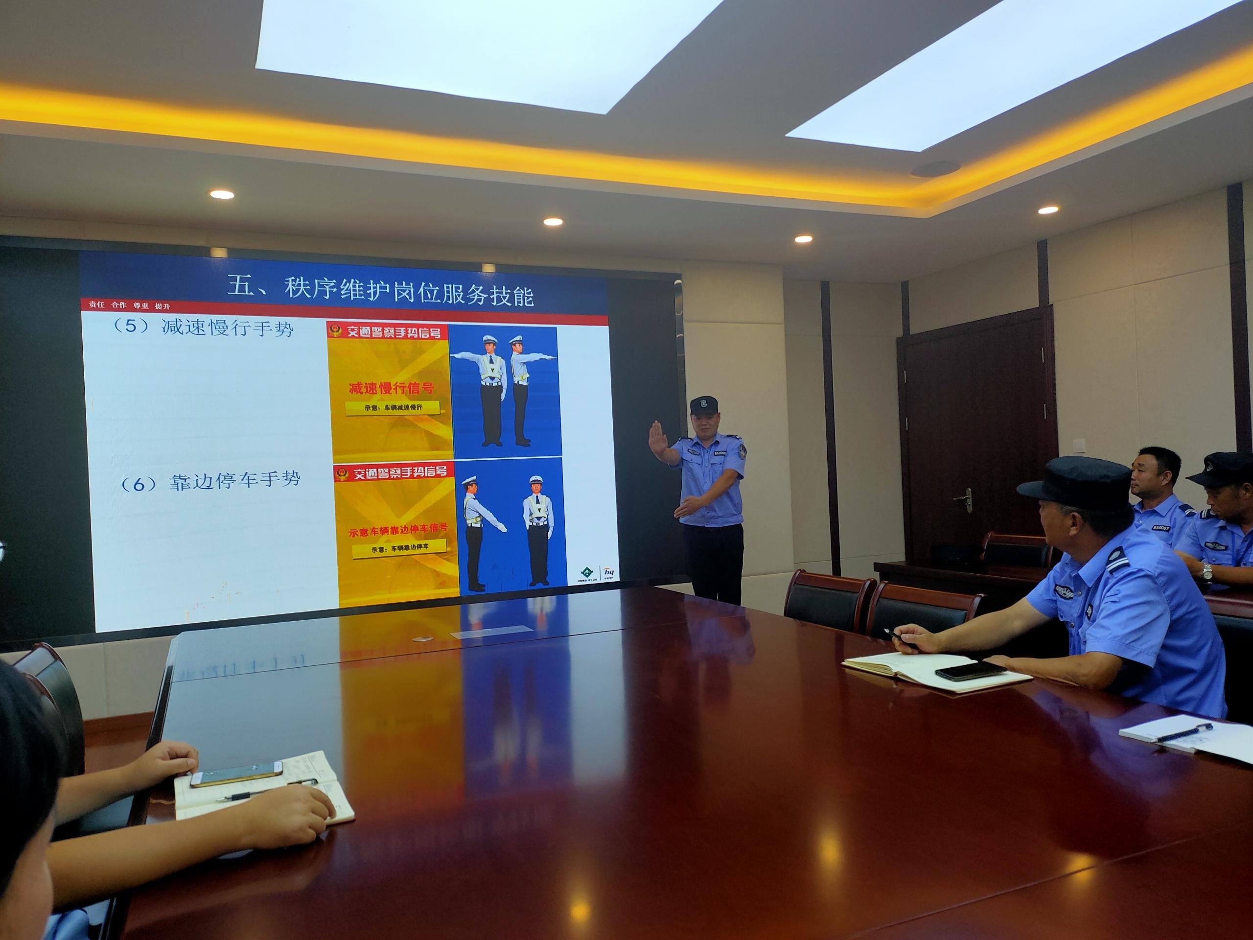 此次培訓(xùn)主要講解了道路交通法律法規(guī)、交通標(biāo)識標(biāo)線、交通事故認(rèn)定知識以及如何正確文明行車。根據(jù)保安人員崗位職能特點,結(jié)合校園周邊交通現(xiàn)狀及交通陋習(xí)等方面,教授安保人員如何做好一名校園交通安全宣傳員、引導(dǎo)學(xué)校學(xué)生安全上下學(xué)、應(yīng)急處理校園周邊交通事故等。 隨后介紹了常用的交通指揮手勢,講解指揮手勢的動作要領(lǐng)及含義。