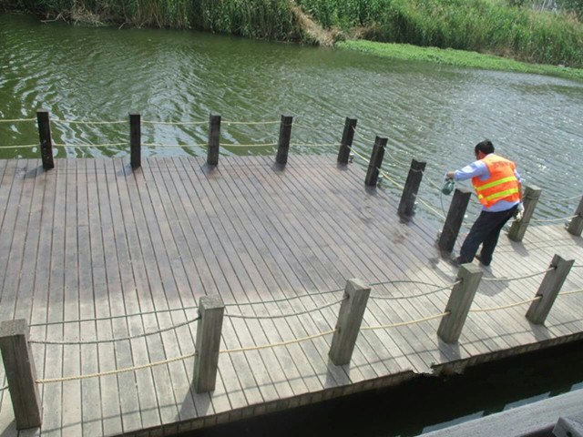 維保工作首先從為民河公園開(kāi)始。為民河公園于201212月竣工投入使用,為園區(qū)最早建成的景觀公園之一。公園內(nèi)有賈拉木棧道約570平方米,硬木扶手、欄桿約402米。隨著使用年限增加,公園部分設(shè)施特別是木棧道、親水平臺(tái)等逐漸發(fā)生了老化,木材表面出現(xiàn)不同程度的褪色和裂紋,影響了親水平臺(tái)的景觀效果。為此,公司先安排維保人員對(duì)破損處進(jìn)行維修,然后清掃干凈噴漆,待自然晾干后開(kāi)放通行,給親水平臺(tái)穿上了新“嫁衣”。